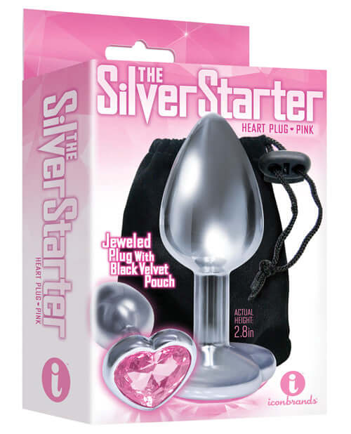 From the Nines collection Silver Starter Heart Bejeweled Steel Plug with Pink Stone on its end. Sleek chrome metallic body and glitzy heart shaped bejeweled base on the anal plug perfect for beginners, designed and sized for easy insertion. Non-porous, easy to clean. Body safe stainless steel. Actual height 2.8 inches. Includes black storage bag.