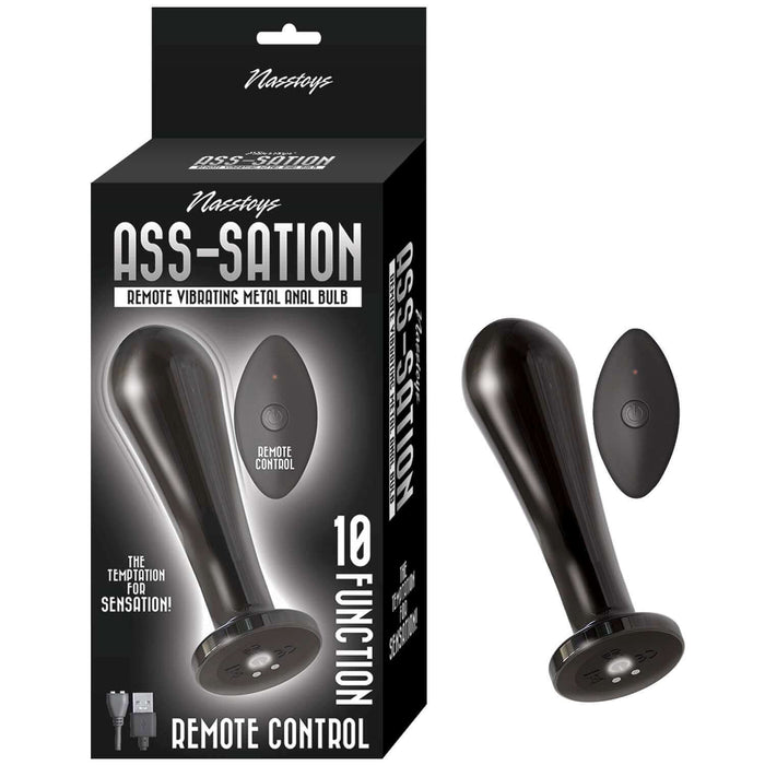 Ass-Sation Remote Control Vibrating Metal Anal Bulb Black from Nasstoys of New York. Ass-Sation brings together metal and vibration for orgasmic results. For lovers of metal sex toys, you can now take part in a vibration in your favorite material sensation. Explore 10 different vibrating functions using the controls on the toy or the handy remote control. Try immersing the Ass-Sation Remote Control Vibrating Metal Butt Plug in warm or cool water before hand for fun sensation play. The Bulb Plug is a perfectly mid-sized vibrating plug with a wonderfully curvy shape, with 10 patterns of orgasmic vibration. Sized for most levels of butt play experience, the Bulb’s tip is bulbous with just enough plush flexibility for comfy insertion. A tapering body follows the head, leading into a nice wide base that provides a great grip and protects against too deep penetration. A single push button at the base controls the motor, it is always within easy reach if you do not want to use the remote control. Use with any of your favorite lubricants. After use, carefully wash the toy with mild soap and water or Toy Cleaner for even quicker clean up. Features: 10 function.Remote control. Body safe. Power button lights up. RoHS compliant. Phthalates free. Waterproof vibrator. Materials for the Anal Bulb Aluminum, Silicone, Remote Control ABS Plastic. Anal Plug size length 4.25 inches, width 1.25 inches, circumference 4.25 inches around. Remote Control size 3 inches by 1.75 inches. Rechargeable vibrator: charing time 2.5 hours, working, play time 2 hours. Voltage 3.7V. Categories: Anal Toys, Prostate Massagers, P-Spot Stimulators, Small and Medium Butt Plugs, Rechargeable Vibrators. 2023.