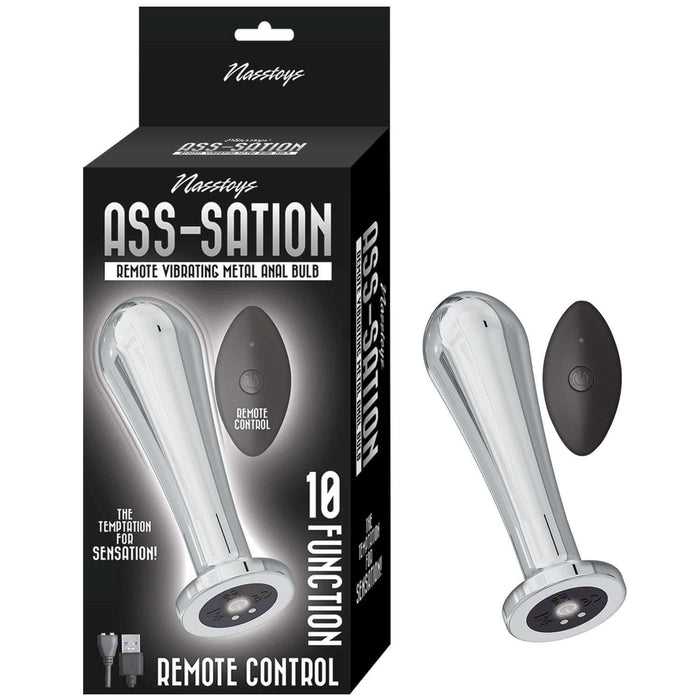 Ass-Sation Remote Control Vibrating Metal Anal Bulb Silver from Nasstoys of New York. Ass-Sation brings together metal and vibration for orgasmic results. For lovers of metal sex toys, you can now take part in a vibration in your favorite material sensation. Explore 10 different vibrating functions using the controls on the toy or the handy remote control. Try immersing the Ass-Sation Remote Control Vibrating Metal Butt Plug in warm or cool water before hand for fun sensation play. The Bulb Plug is a perfectly mid-sized vibrating plug with a wonderfully curvy shape, with 10 patterns of orgasmic vibration. Sized for most levels of butt play experience, the Bulb’s tip is bulbous with just enough plush flexibility for comfy insertion. A tapering body follows the head, leading into a nice wide base that provides a great grip and protects against too deep penetration. A single push button at the base controls the motor, it is always within easy reach if you do not want to use the remote control. Use with any of your favorite lubricants. After use, carefully wash the toy with mild soap and water or Toy Cleaner for even quicker clean up. Features: 10 function. Remote control. Body safe. Power button lights up. RoHS compliant. Phthalates free. Waterproof vibrator. Materials for the Anal Bulb Aluminum, Silicone, Remote Control ABS Plastic. Anal Plug size length 4.25 inches, width 1.25 inches, circumference 4.25 inches around. Remote Control size 3 inches by 1.75 inches. Rechargeable vibrator: charing time 2.5 hours, working, play time 2 hours. Voltage 3.7V. Categories: Anal Toys, Prostate Massagers, P-Spot Stimulators, Small and Medium Butt Plugs, Rechargeable Vibrators. 2023.