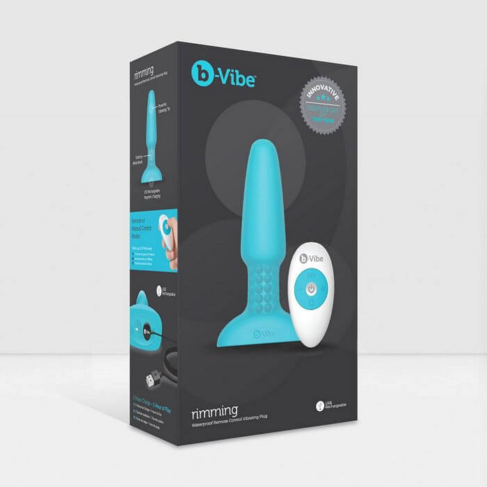 Rimming Plug Teal. Meet the first premium plug engineered to incorporate rotating beads for a rimming sensation and powerful tip vibration for orgasmic stimulation.This compact, certified body safe, seamless, silicone plug is powerfully charged to stimulate all the right spots.Use with or without the wireless remote control that not only makes use a breeze, it also allows for diverse couple play possibilities. Soft Seamless Silicone unique beaded neck. Hypoallergenic and body safe. Splash proof and shower friendly. Easy to clean. 1 hour of play, USB Rechargeable. Product dimensions 6.2 inches by 3 inches by 11 inches. Shipping weight 1.9 pounds. The B Vibe Rimming Butt Plug is the first ever anal plug with spinning beads in the neck that create a rimming sensation like no other! This premium silicone plug features a motor in the tip for strong, orgasmic stimulation. This compact, certified body safe, seamless, silicone plug is powerfully charged to stimulate all the right spots. The plug includes a cordless remote control for interactive couples play. You may use the plug with or without the remote control for versatility. The vibe features five vibration and rotation intensity levels and six vibration patterns. Waterproof. The B-Vibe Rimming Vibe is 6 inches in total length, 4.5 inches insertable, and a maximum diameter of 1.5 inches. The vibe is rechargeable and includes a magnetic USB charging cord. The remote control uses a CR2032 battery, included. Be sure to remove the liner inside the remote before use by sliding the back open. Use only water based lube with the B-Vibe. Do not use silicone lubricant with this silicone toy.