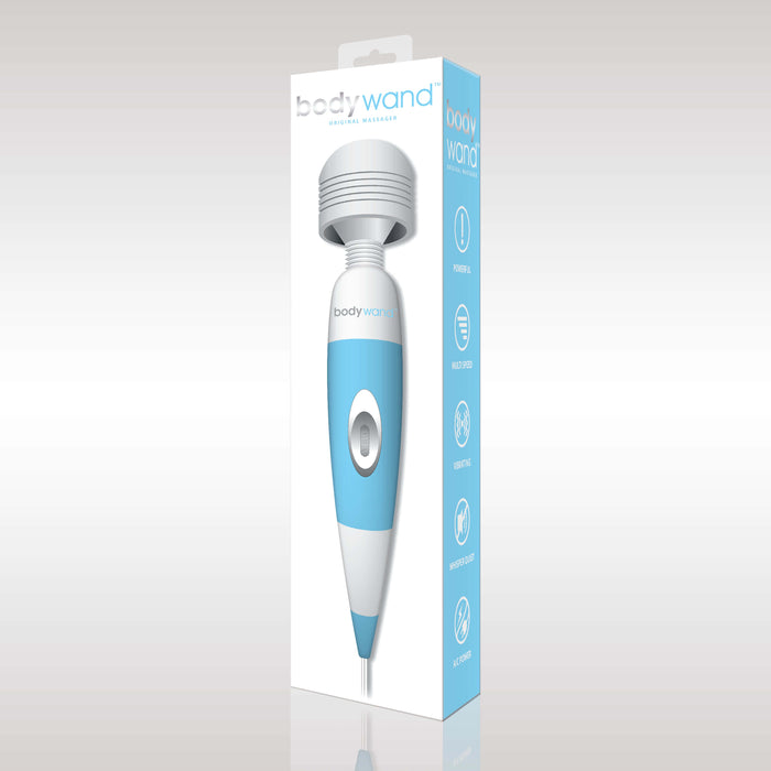 Bodywand Plug In Blue Massager. From its robin egg blue color to the rounded, soft touch head, the Bodywand Original massager is engineered with a distinctly feminine feel. A simple ergonomic one finger control dial lets you adjust the A/C power output from a flutter to a freight train, though the wand never sounds louder than an easy hum. The flexible neck reaches all angles and can be fitted with an range of attachments to create a palette of sensual delights. Features: one touch operation. Control dial for infinite speeds. A/C power - just plug it in and start enjoying. Comes with a one year manufacturer warranty. Bodywand personal massager for every part of your body. Bodywand is a registered trademark for X-Gen Products. Colors may vary. (2*)