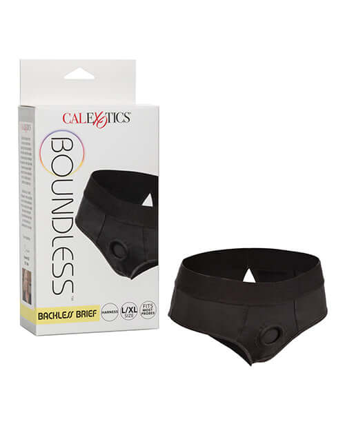 Boundless Backless Brief L/XL Harness Black from California Exotic Novelties. The Boundless Backless Brief is an ultra comfortable harness fashioned like a risque backless brief with powerful performance and comfort in mind. This bold harness has an extra wide waist band, soft stretchy fabric and reinforced O ring for the ultimate support. The durable, reinforced O-ring stretches to accommodate your favorite packer, vibrator or dildo. With a form fitting design, this comfort harness can be worn discreetly under clothes. Enjoy pleasure made for two with the double panel interior for easy access to your favorite probe. Beginners and expert users alike will love frustration free pleasure with this easy to wear harness. Simply secure your favorite probe, slip into the bold backless brief and dive deep into passionate penetration or enjoy comfortable all day wear. Enjoy easy clean up by machine washing and hanging to dry. Ladies sizes L to XL, Large to extra large. Material composition: 78% Nylon, 22% Spandex. One year warranty from California Exotic Novelties.