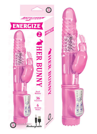 Energize Her Bunny 2 Pink Rabbit Vibrator features rechargeable. USB cable included. Dual motors. 36 functions. 6 rotating modes. Waterproof vibrations. Made using body safe phthalates free RoHs compliant materials shaft Thermoplastic Elastomers TPE, base ABS plastic. Size length 9 inches, insertable length 4.5 inches. Rechargeable no batteries necessary.