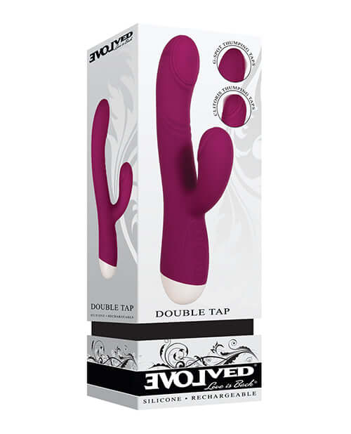 Evolved Double Tap Tap into intense dual orgasms that deeply satisfy. With a persistent thump-thump against your clitoris and a delicious tap tap on your G-Spot simultaneously, your pleasure goes into overdrive, building to a delicious double climax that leaves you completely fulfilled! Targeted stimulation that zeros in on the pure ecstasy of your erogenous zones. Choose from 7 powerful speeds for each independently operated motor. Plug into any USB source for a full charge. Clean with Evolved Toy Cleaner and warm water. Features: dual tapping G-Spot toy. Thumping taps on clitoris and G-Spot. Build to intense dual orgasms. 7 tapping speeds in G-Spot shaft. 7 tapping speeds in clitoral shaft. Textures at each head. Flexible to move with your body. Made from creamy smooth silicone. Detail made from ABS plastic. White pearl finished handle. 3 button control panel. Buttons light up when in use. Height 8.75 inches, depth 3.3 inches, width 1.6 inches. Insertable length 5 inches, width 1.35 inches. Waterproof vibrations and submersible. Phthalate free and latex free. Rechargeable, USB cable included. 5 years warranty.