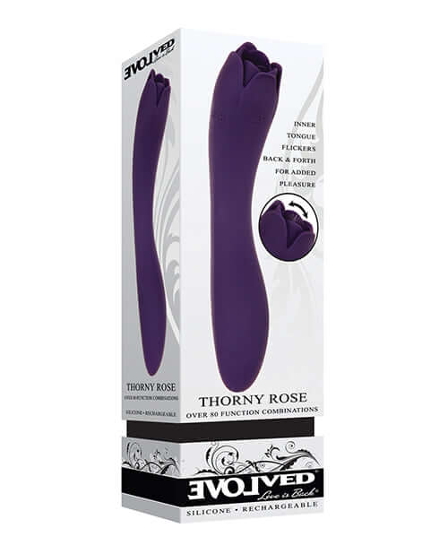 Evolved Thorny Rose Vibrating Massager. Imagine a supple rose cradling your clitoris and licking it gently as your pleasure builds and builds to a powerful climax. Then imagine that same toy flipping over to deliver internal vibrations for deep satisfaction! This dual end massager brings fantasy to life with two 9 speed motors and a flexible shaft that moves with your body, even under water as it is completely submersible. Body safe, rechargeable, easy to clean. Let your sensuality blossom. Features: powerful dual end massager vibrator on one end, tongue flicking rose on the other. Made from smooth and supple silicone. 9 powerful vibrating speeds and functions. 9 tongue flicking speeds and functions. Flexible to move with your body. 5 inches insertable length, 1.66 inches diameter. Easy to use 2 button control. LED illuminates buttons when in use. Height 7.75 inches, depth 1.6 inches, width 1.66 inches. Weight under .5 pound. Waterproof vibrations and submersible toy. Phthalate free and latex free. Rechargeable, USB cable included. 5 years warranty.