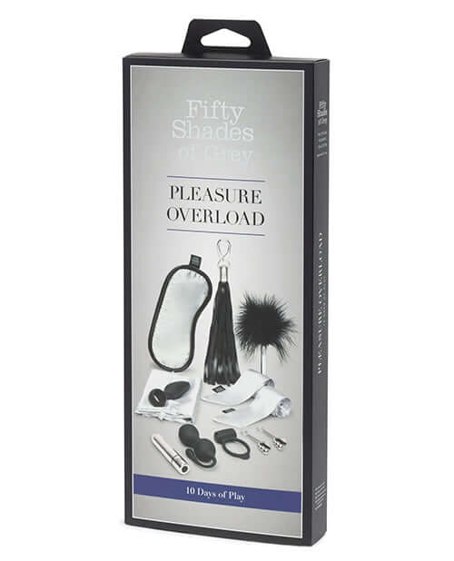 Fifty Shades Of Grey Pleasure Overload 10 Days Of Play Gift Set Black from Love Honey. Get ready for ten incredible days of sexual intrigue and delight with this tantalizing gift box. Share the thrill of opening a mystery door each day with your lover to discover a sensual or bondage treat, with items for him, her and both of you. Perfect for introducing you to new ways to play together, your ten days of fun will lead to many more blissful adventures beyond. The sensual pleasure toys offer all kinds of intimate stimulation, while the bondage accessories make the perfect introduction to sensory and restraint play. All of your toys and accessories can be safely stored in the satin bag which you will also find behind one of the doors. Use vibrating and insertion adult toys with water based lubricant to heighten sensation in play. Features Thrilling Pleasure Overload Gift Set that is ideal for a romantic gift. Mystery doors reveal sensual pleasure toys and bondage play accessories. Items for you, your lover, and the two of you to share. Experience exhilarating surprises together as you open each door. Perfect introduction to sensory and restraint play. Part of the Fifty Shades Freed The Official Pleasure Collection approved by author E L James. Bullet vibrator requires 1 AA battery, not included. Sold separately. Cock Ring requires 2 AG3/LR41 batteries, 6 included. Gift set includes tapered butt plug, restraints and blindfold, adjustable nipple clamps, vibrating cock ring, Ben Wa Balls, bullet vibrator, small flogger and a feather tickler.