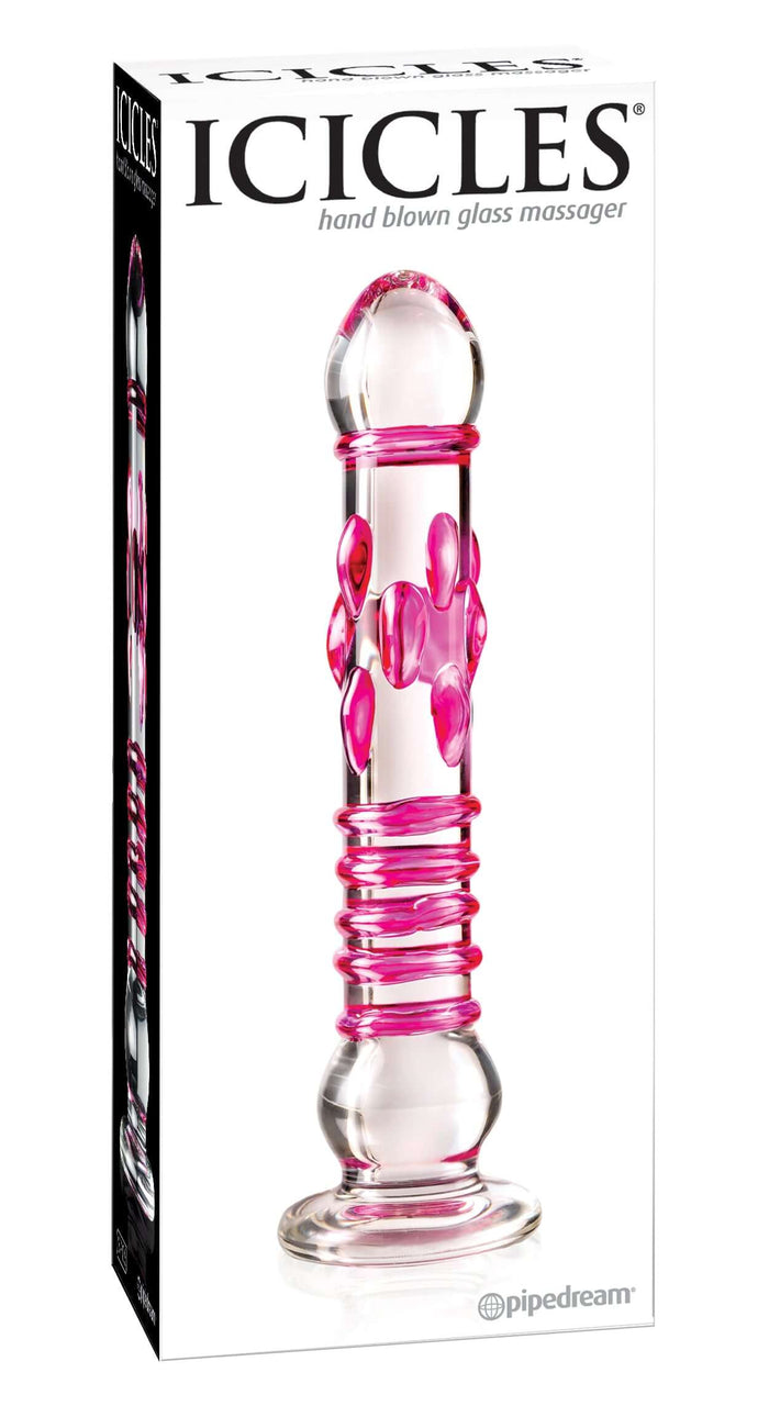Measuring 8.5 inches in length and 1.75 inches in width, with a girth of 4.5 inches, Icicles No. 6 is a sophisticated and sleek wand that stands out for its complexity and functionality. It features a clear glass design with a rounded head, a single ring at the neck, pleasure nubs on the upper half, and four perfectly sized rings for both internal and clitoral stimulation. The wand is completed with a faux testicle near the base and a flat base for stability.