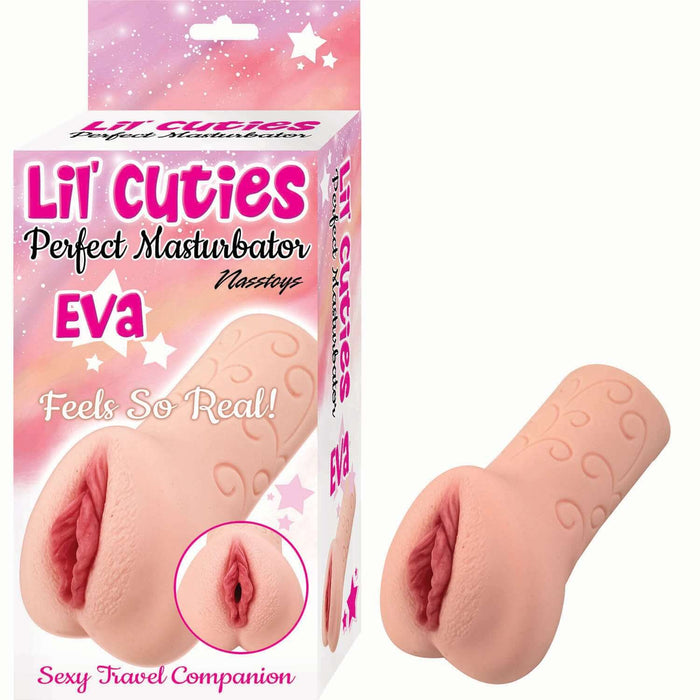 Lil Cuties Perfect Masturbator Eva from Nasstoys of New York. Sexy travel companion. Soft, tight and realistic. Textured suction tunnel for the real feel. Waterproof, non-vibrating stroker. Phthalates free, body safe materials Thermoplastic Rubber TPR. Size length 4.5 inches, width 2.5 inches, circumference 7.25 inches.