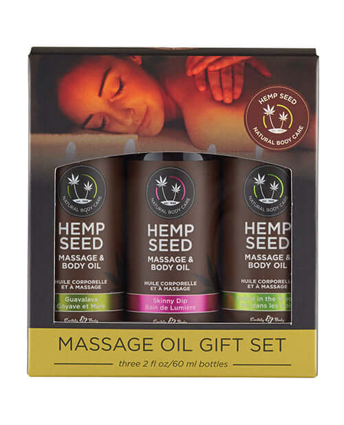 Elevate your intimate moments with the Massage Oil Gift Set 3 x 2 Oz Bottles by Earthly Body. This luxurious gift box contains three 2-fluid-ounce bottles of natural massage oils, each infused with delightful scents to suit your every mood and desire.