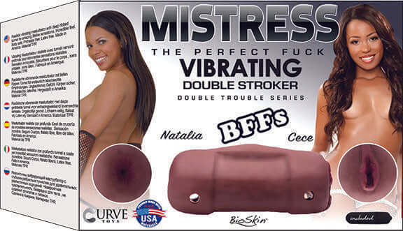Mistress Double Stroker Natalia and Cece from Curve Toys. Vibrating Double Ass and Pussy Stroker. Dual entry with super soft realistic feeling. Realistic anus and vagina design with highly textured tunnel for maximum pleasure. Full size design with ergonomics grip pattern. Full size design with ergonomics grip pattern. One touch bullet included. Low maintenance. Easy to clean. Features:double masturbator. Materials Thermoplastic Rubber TPR. Dimensions 6 inches by 2.6 inches in width. Weight 11.50 ounces. Care clean before and after use with a mild soap and water. Pat dry then sprinkle with cornstarch powder to extend life of product. Store separately in a cool, dust free location.