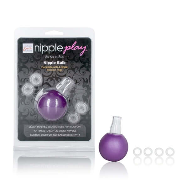Nipple Bulb lets your nipples rise to any occasion. Nipple enhancing bulb with 4 erection rings. Safe and pure for body and pleasure. Made using phthalate free, non-toxic materials ABS plastic nozzle, PVC bulb, rings. Tip diameter .4 inch. Bulk weight 1.4 ounces. Pursuant to 18 U.S.C. 2257, Nipple Bulb was produced on November 21, 2001, and the records required to be kept by that law are available at 14235 Ramona Avenue, Chino, CA 91710. Custodian of Records: S. Colvin. Category: For Women, Attire & Adornments, Jewelry. Nipple Bulb is a registered trademark for California Exotic Novelties. Sex toys and sexual wellness. Made in the USA.