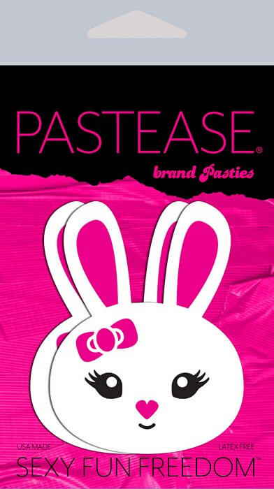 Bunny! Cute White Bunny with Pink Heart Nose, Ears and Bow Nipple Pasties By Pastease are hand made in the USA of soft yet durable Eco-fi felt material that forms to curves and resists wrinkling over hardening nipples. Just peel and stick on clean, dry skin. All Pastease feature latex free, medical grade, waterproof adhesive that stay securely in place for as long as you like and until they are gently removed. Conceal or reveal with Pastease nipple pasties when worn with a sexy outfit, daring bikini, sheer top, revealing dress, Hefty bag, body lotion, crazy costume, party theme or nothing at all! Dimensions 2.6 inches wide by 3.4 inches tall. Coverage diameter 2 inches.