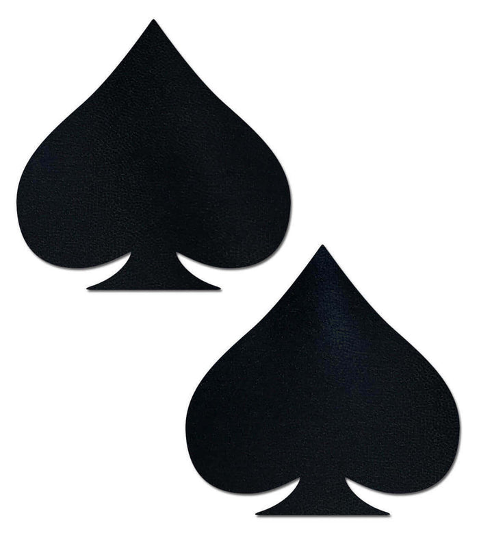 Pastease Liquid Black Spade Pasties. Liquid Black Spade Nipple Pasties by Pastease are hand made in the USA of soft form fitting material forms seamlessly to curves and resists wrinkling over hardening nipples. Easy to use. Just peel and stick on clean, dry skin. All Pastease feature latex free, medical grade, waterproof adhesive that stay securely in place for as long as you like and until they are gently removed. Conceal or reveal with Pastease nipple pasties when worn with a sexy outfit, daring bikini, sheer top, revealing dress, Hefty bag, body lotion, crazy costume, party theme or nothing at all! Dimensions: 2.8 inches by 2.8 inches. Coverage 1.9 inches. Pastease are the fun maker that brings out your inner Tease! All Pastease products are hand made, so the finished product you receive may vary slightly from the posted image. Go get your sexy fun freedom on with Pastease Brand Pasties!