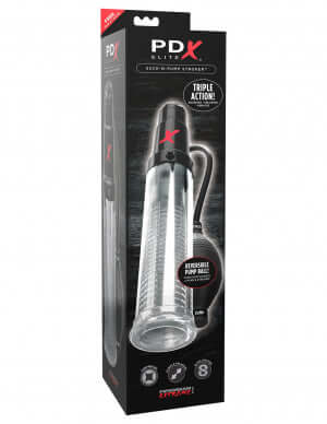 Experience 2 ways to intensify your erection with 1 genius stoker! The PDX Elite Suck N Pump Stroker features a medical style pump ball that functions as an erection pump in one position and as a masturbation stroker in a second position, double the performance options of an ordinary pump! Customize your pleasure! Penis pump with each squeeze of the medical style pump ball in the pump position a super strong vacuum is created inside the chamber, forcing your erection to quickly expand its length and girth. Masturbation stroker: when the pump ball is placed in the stroker position your shaft is surrounded by super tight oral sex suction. Twist the top dial to activate powerful multi-speed vibrations for additional stimulation. The soft Thermoplastic TPR sleeve forms an air tight seal against your skin, creating incredible suction and amazing results, while the crystal clear tube is designed for a firm grip and has a convenient ruler to gauge your expansive growth. You can instantly relieve pressure by pressing the air release valve above the pump cylinder. Conveniently waterproof for fun in the bath or shower. Care Instructions - when you are done, simply detach the cylinder from the top motor portion and remove the TPR sleeve for cleaning. Cleanup is a snap after the fun with Refresh Toy Cleaner and warm water. Allow to air dry completely before storing. The interior sleeve is removable for easy cleaning. Every PDX ELITE Suck-N-Pump Stroker size length 13 inches, width 3 inches, height 3 inches, inner diameter 2 inches, insertable length 6.5 inches. 2 AA batteries, not included. Materials Thermoplastic Elastomer TPE, Thermoplastic Polyurethanes TPU, ABS Plastic.