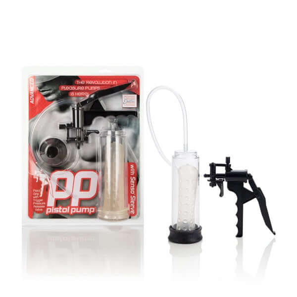 Easy pumping action! Pistol Pump is a classic penis pump. Pistol grip trigger with a supple noduled removable internal Senso sleeve. The Senso sleeve is a very stretchy rubber material with bumps on it for extra stimulation. Lubricant included. Safe and pure for body and pleasure. Made using phthalate free, non-toxic materials PVC sleeve, hose, ABS plastic cylinder, pump. Cylinder measures 8 inches long by 2.5 inches wide. Bulk weight 13.3 ounces. Always clean before and after use. Category: For Men, Pumps, Non-Vibrating. Pistol Pump is a registered trademark for California Exotic Novelties. Sex toys and sexual wellness.