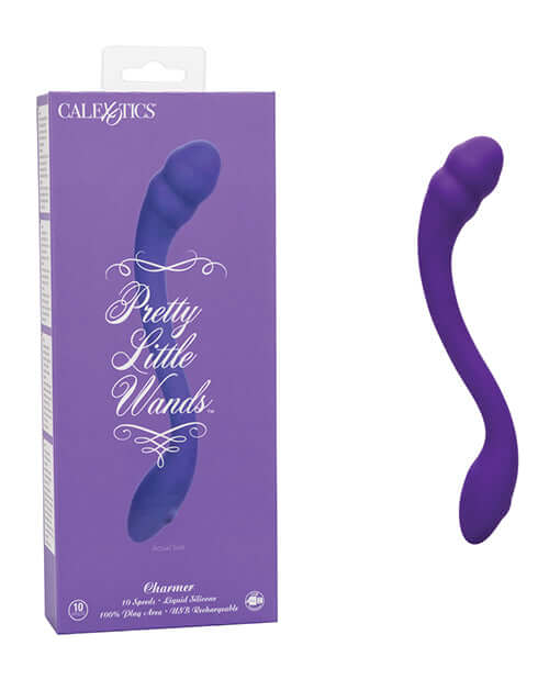 Pretty Little Wands Charmer Purple Vibrator from California Exotic Novelties. Indulge in your magical side and cast a spell for endless pleasure with the Pretty Little Wands Charmer. Thrust yourself towards new heights of pleasure with the unique slim massager complete with 10 speeds of vibration, a multi-directional flexible body, and indulgent dual ended design. Sure to hit just the right place, the flexible massager has multi-directional positioning to flex and bend into the perfect position. Get lost in pleasure alone or with a partner with the indulgent dual ended design. Up the intensity with 10 incremental speeds of vibration pulsating throughout the slim massager. While the easy touch button controls the intensity and the vibe gives you the stimulation you want, the pliable body holds any position you desire. Recharge the premium silicone teaser in 2.5 hours with the provided USB charging cable to enjoy 35 minutes of high speed stimulation or 90 minutes of low speed vibrations. The premium liquid Silicone is made to be softer, smoother, and more durable than you have ever experienced before. A state of the art memory chip remembers just how you like it by resuming on the last function used when turning back on. Specifications: SKU SE-4380-05-3. Color Purple. Power source USB Rechargeable, cord included. 1 year warranty. Material type Silicone. Features: Phthalate Free, Waterproof, Rechargeable, Vibrates. Measurements 7 inches by 1.25 inches massager. Bulk weight 1.8 ounces. Package shipping weight 8.3 ounces. Package 1.5 inches by 4 inches by 10.5 inches. Categories: Magic Wands, Body Massagers, Sex Toys for Women, Realistic, G-Spot Flexible Vibrators.