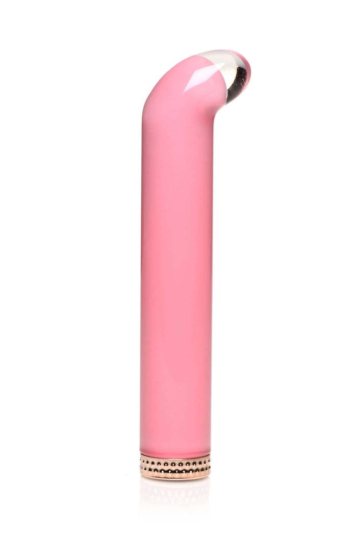 Introducing the Prisms Vibra Glass 10X G-Spot Vibrator in Pink from XR Brands - an elegant and powerful glass bullet vibrator designed to deliver a sensational and sexy experience. This exquisite vibrator features a unique pink color, a round curved end, and a golden ring at the base, adding a touch of sophistication to your pleasure sessions.