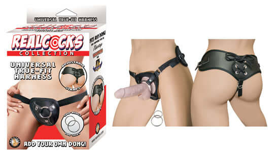 Real Cocks Universal True Fit Harness Black. Compatible with all dongs. Couple friendly. Perfect for pegging. Pull to size and trim to fit. Add your own dong! Harness only. Materials Harness faux leather polyurethane PU coat, Rings metal. Ring sizes 2 inches and 2.5 inches. One size fits most. Harness fits waists up to 56 inches, UPC number 782631280807.
