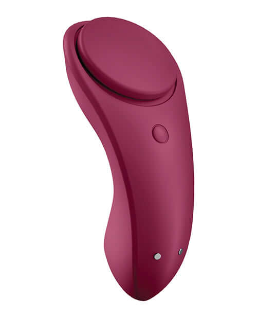 Satisfyer Sexy Secret Panty Vibrator Wine Red a clitoris stimulator for on the go. The Sexy Secret from Satisfyer provides sensual stimulation on the go, just attach the panty vibrator to your panties with the handy magnet so you can stimulate yourself with powerful, whisper quiet, vibrations and spice up your everyday life. The ergonomic shape means it fits perfectly to your body contours, lying directly on the clitoris and providing you especially intense stimulation. The surface, made of body friendly silicone, is especially soft, providing you with smooth fun with just a few drops of lubricant. Panty vibrator with Satisfyer Connect. This portable clitoris vibrator can also be controlled easily on the go: you can operate it intuitively with the Satisfyer Connect app. Control the vibrations of this panty vibrator using your cell phone or your Apple Watch, or let someone else control it for you from anywhere in the world! Let your creativity run free with the new Satisfyer Connect app! Can also be used without the app. You can also create your own vibration programs and share them with other app users, and create vibration patterns based on your Spotify or music library playlists. Because this panty vibrator is waterproof, IPX7 rating, you can also use it in wet areas, like the shower or bathtub and clean it easily with warm water and mild soap. If your Sexy Secret Panty Vibrator ever runs out of steam, you can recharge the integrated batteries with the included USB charging cable. 15 year guarantee. CES Innovation Awards 2021 Honoree. Please note no panty included.