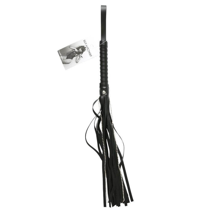 Sex and Mischief line small pleasure whip. Tickle, tease or just compliment your look with the S&M Crystal Whip. A sexy addition to your toy box, this black slender whip boasts a single strand of clear crystals running the length of the faux leather tails. Deliver a lashing with a distinctive shimmer. A handle bound in black vegan leather provides a comfortable grip and guides the eye to dangling tails that entice as they shine. This crystal impact instrument is sure to make you feel an extra bit of sparkle as you prepare to lash your consort. An extraordinary dom should not settle for an ordinary flogger! This beautiful tool will catch the light with every swing, keeping your lover's attention even as they gasp and moan in pleasure and pain. Crystal Whip specifications: materials Vinyl fabric, nickel free metal hardware, wood, copper, plastic, stannum. Measurements 24 inches. Includes: 1 whip measuring 24 inches overall.