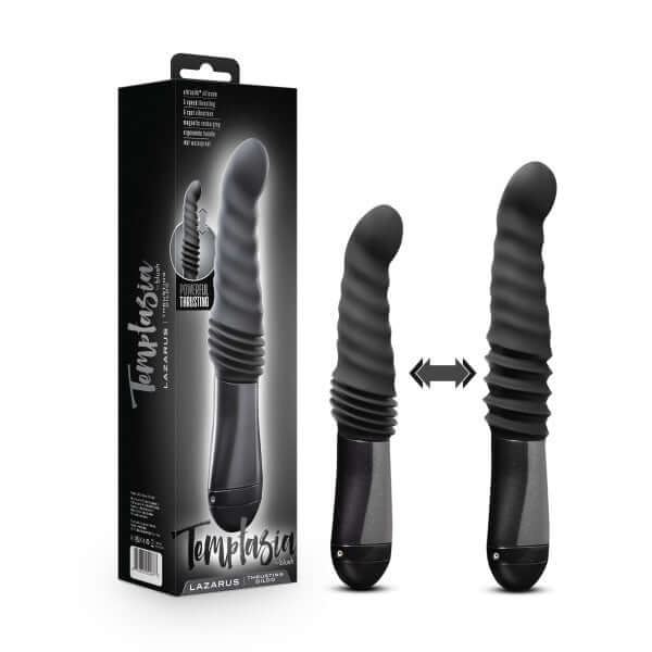 Temptasia Lazarus Thrusting Dildo Black from Blush Novelties. Temptasia - Lazarus - Thrusting Dildo - Black. Collection Temptasia. Beautiful pleasure is yours to have with the Temptasia Lazarus. This beautiful toy has 3 powerful thrusting speeds, 1.25 inches thrusting length and a curved shaft for optimal G-Spot and P-Spot stimulation! Lazarus has a long, ergonomic handle for optimal accessibility and comfort during play and a ribbed body for additional sensations during thrusting. Made of Puria Platinum Cured Silicone, Lazarus is body safe, phthalate free, fragrance free, latex free, and easy to clean. USB magnetic rechargeable, to ensure it remains waterproof for the life of the product and IPX7 waterproof, Lazarus is ready to be your most loved temptation. Features: 3 powerful thrusting speeds with 1.25 inches thrusting length. Puria Platinum Cured Silicone is body safe, Phthalate free, fragrance free, latex free. Easy to clean. Long ergonomic handle for optimal accessibility and comfort. USB Magnetic Rechargeable Dildo. IPX7 rated waterproof vibrations. Pure Platinum Cured Puria Silicone. Ultrasilk smooth. Categories: Rechargeable Vibrators, Dildos and Dongs, Unnatural Dildos, Dongs, G-Spot Stimulator. 90 days warranty.