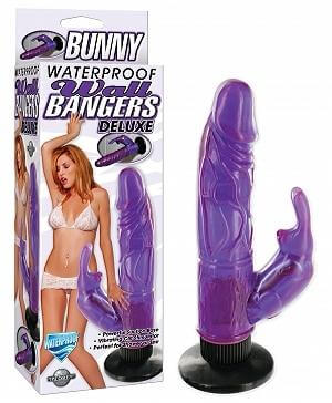 Waterproof Bunny Wall Bangers Vibrator Purple. Enjoy wall-banging satisfaction every time with this incredible vibrating suction dong with clitoral stimulator. Its powerful suction-cup base holds the dong securely in place, providing a thrilling stimulation right where you want it. Stick it to the floor, wall, bedpost, or almost any flat surface. You will be amazed how it stays put during every passionate thrust! The soft jelly material feels life-like and bends to conform to your contours, while the vibrating clitoris stimulator hits the right spot every time. Vibrator measures 8.5 inches long by 3 inches wide. Girth 4 inches around. Vibrating sex toy requires 2 AA batteries, not included. Do not leave batteries in the vibrator between uses. A water-based lubricant is recommended. Made using phthalate free, non-toxic materials Thermoplastic Rubber shaft, beaver, ABS plastic suction cup base.