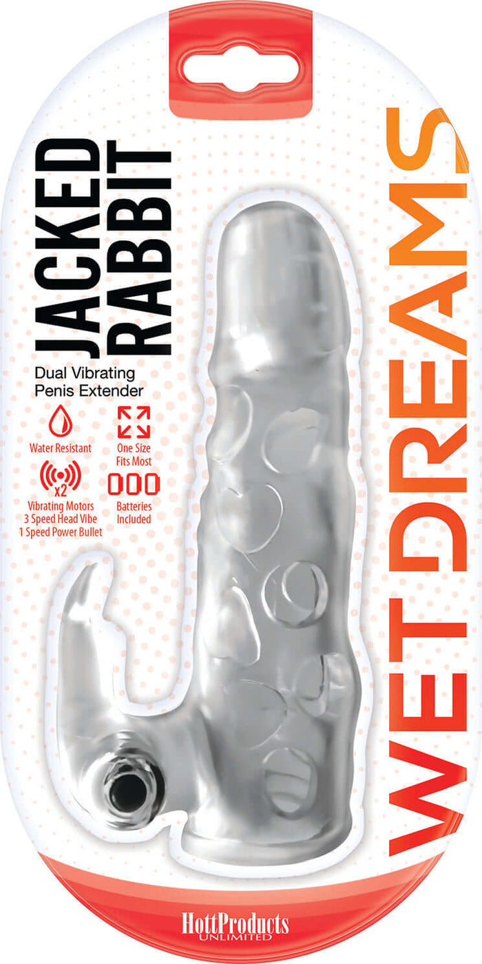 Elevate your intimate moments with the Wet Dreams Jacked Rabbit Extension Sleeve by Hott Products. This dual vibrating penis extender is designed to enhance pleasure for both partners, boasting a rabbit-style clitoral stimulator and two powerful bullet vibrators, offering dual sensations and heightened pleasure.