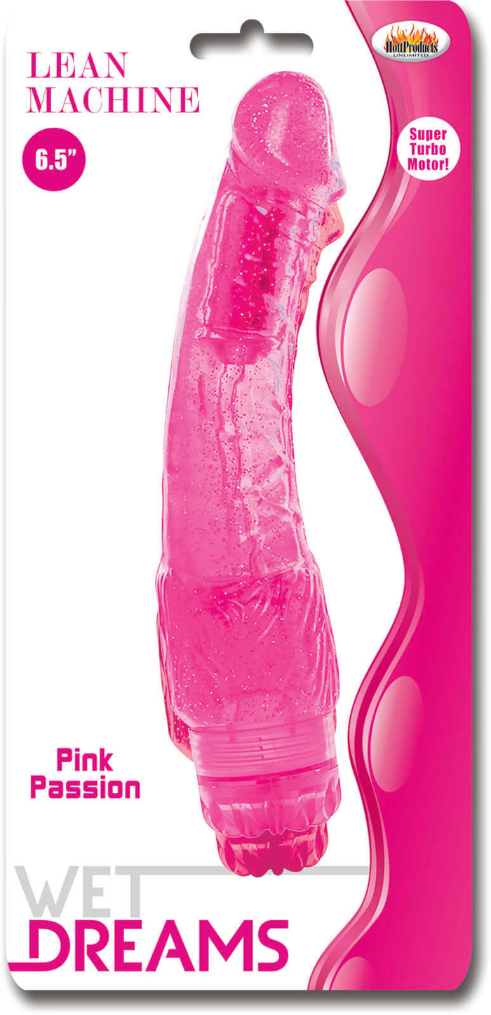 Wet Dreams Lean Machiner Pink Passion Realistic Vibrator is made using phthalate free materials Thermoplastic Rubber. Super turbo motor. Variable speeds. Vibrating sex toy requires 2 AA batteries, not included. 6.5 inches. Colors may vary.