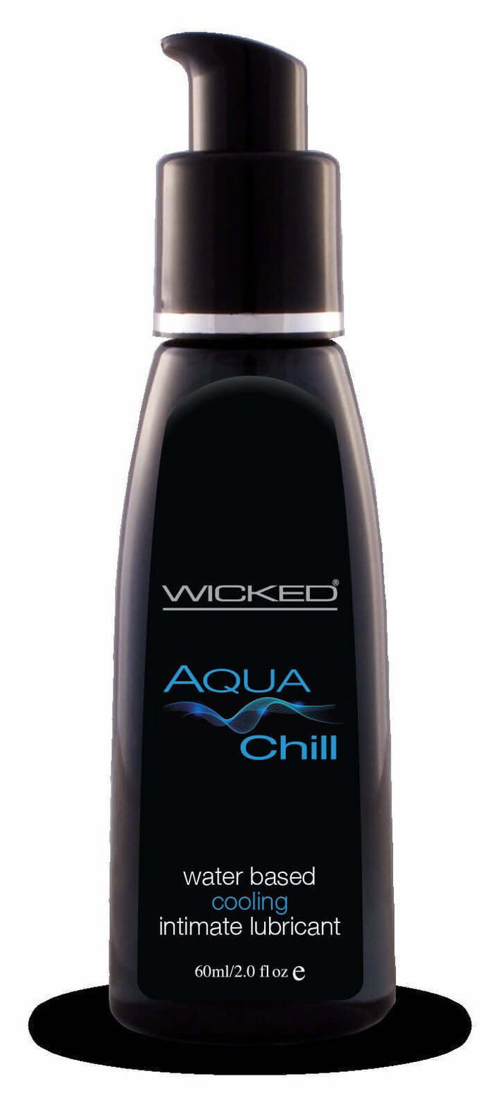 Wicked Sensual Care Collection Aqua Chill 2 fluid ounces. Aqua Chill lets you experience the ultimate in slippery, shivery sensation. This superior quality water based lubricant is designed to keep you cool as playtime gets hot. Natural peppermint leaf, ginger root and menthol combine to tingle and excite pleasure zones. Chilling, thrilling and satisfying! Aqua Chill Lubricant features: never sticky. Fragrance free. Paraben free. Natural extracts. Safe for all adult toys. Long lasting. Vegan friendly. No animal by products or testing. To use: apply to area where lubrication and sensation is desired. Rinses away easily with water. Cautions: if irritation or discomfort occurs, discontinue use and consult a physician. This product is not intended for use as a contraceptive. Avoid contact with eyes. Keep out of reach of children. Ingredients: Water, Propylene Glycol, Glycerin, Lonicera Caprifolium (Honeysuckle) Flower Extract, Zingber Officinale (Ginger) Root Extract, Mentha Piperita (Peppermint) Leaf Extract, Olea Europaea (Olive) Leaf Extract, Polysorbate 20, Methyl Lactate, Menthol, Cellulose Gum, Citric Acid, Sodium Benzoate, Potassium Sorbate. Made in the USA.